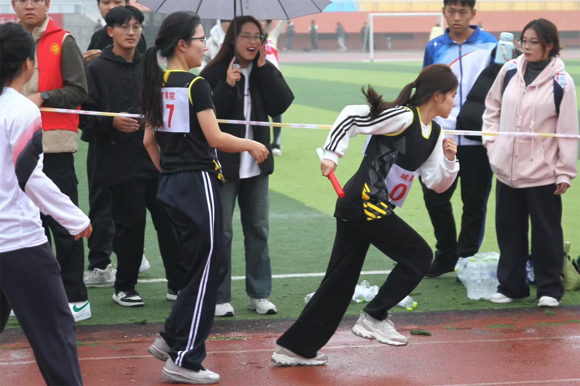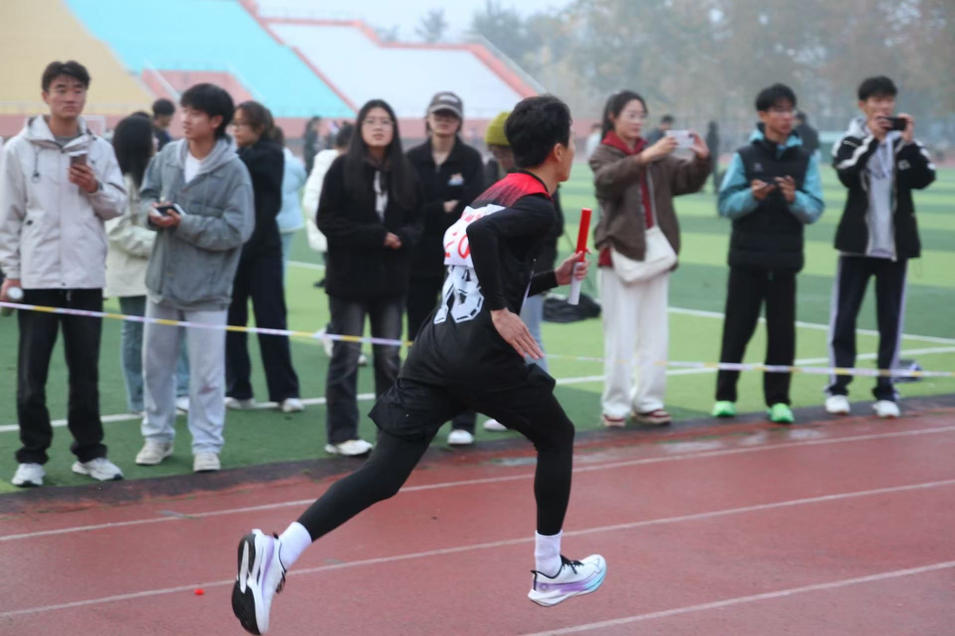赛前,运动员们早早抵达比赛场地集结,以饱满的热情积极开展热身活动,全力准备在赛道上绽放光芒。当日下午两点,运动员们在赛道起点严阵以待,随着一声清脆的枪响,他们仿若离弦之箭疾驰而出。尽管天空中细雨纷飞,但这丝毫无法浇灭运动员们心中炽热的激情和眼中坚毅的光芒,他们用实际行动诠释了伟大的两万五长征精神。赛道旁,同学们的加油助威声浪此起彼伏,声声加油如暖流般沁入运动员心田,使其步伐愈发笃定。