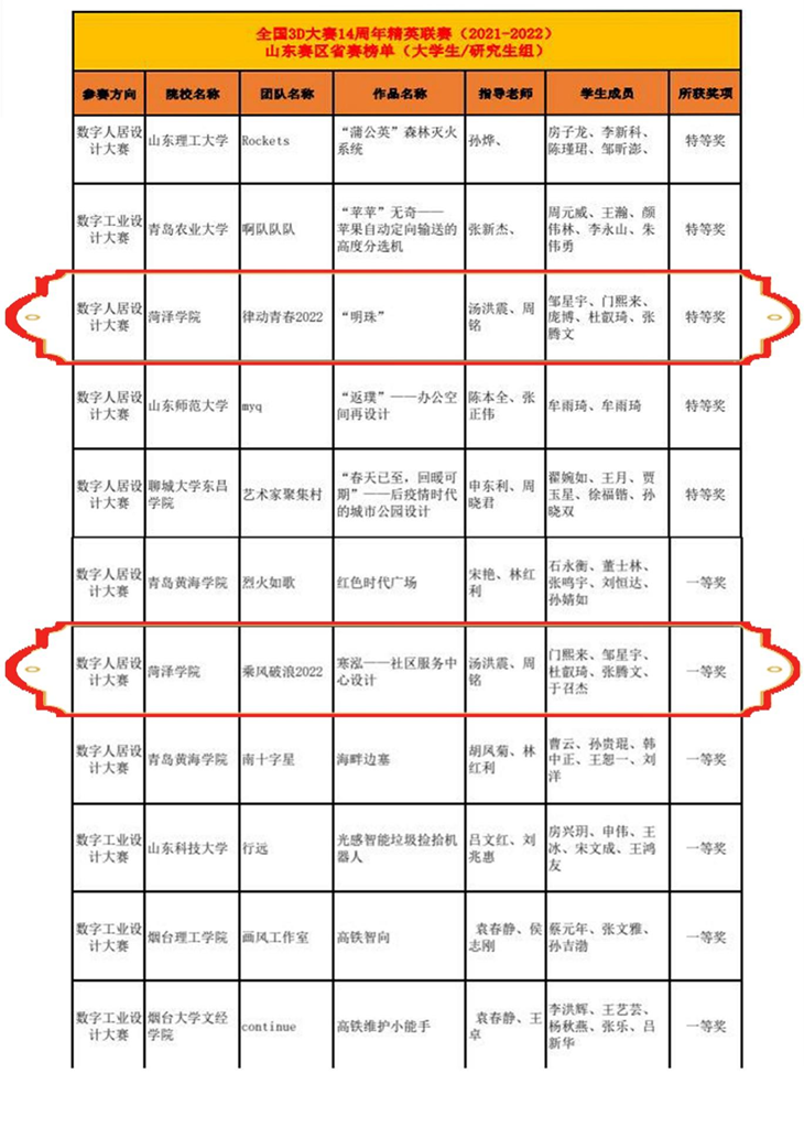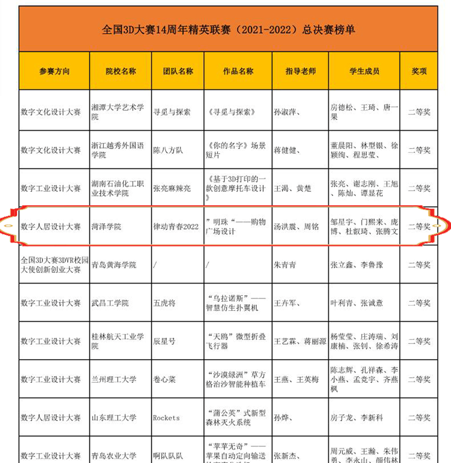 日前,由国家科技部、工信部、教育部、中国科协等部门指导,联合国家制造业信息化培训中心、3D动力、光华设计发展基金会等部门共同主办的全国三维数字化创新设计大赛(全国3D大赛)精英联赛总决赛 落下帷幕。全国31个省/直辖市/自治区赛区,共有452所高校,850个院系报名参赛,经过校赛、省赛层层选拔,总决赛有400余个团队参与角逐。我院汤洪震、周铭老师带领的参赛队伍,在7692件作品中脱颖而出,作品《明珠--购物广场设计》荣获全国总决赛二等奖,同时荣获省赛特等奖;作品《寒泓--社区服务中心设计》荣获省赛一等奖。