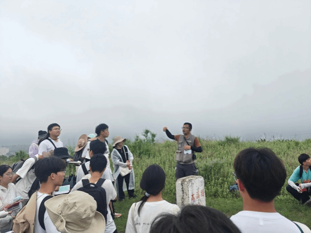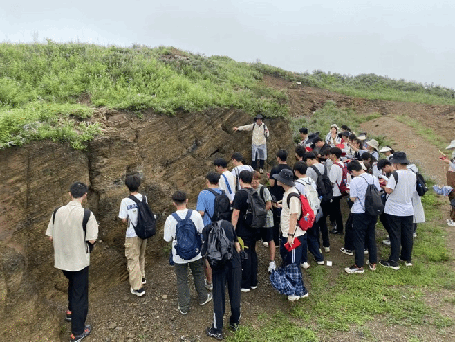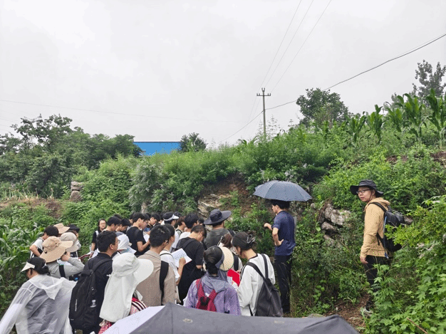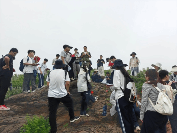 秉承“不驰于空想,不骛于虚声”的务实精神,师生团队深入石门寨村庄,实地考察当地人文景观、周边山地岩石发育及地质构造特征。刘本城老师为同学们介绍了石门寨西门的历史渊源,并剖析了村落人口收缩的现状与成因。在李秀娈、周在征、王子勇和刘晓航等老师的指导下,同学们运用罗盘实操测量岩石产状、判别断层走向,巩固了倾向、倾角测量方法,并系统学习了下奥陶统亮甲山组至上二叠统石千峰组岩石特征及其古环境变迁的指示意义。孔文杰老师于百印台现场讲解了秦皇岛地区气候特点与土壤性质,并引导同学们分析当地植被类型及其生态特征。