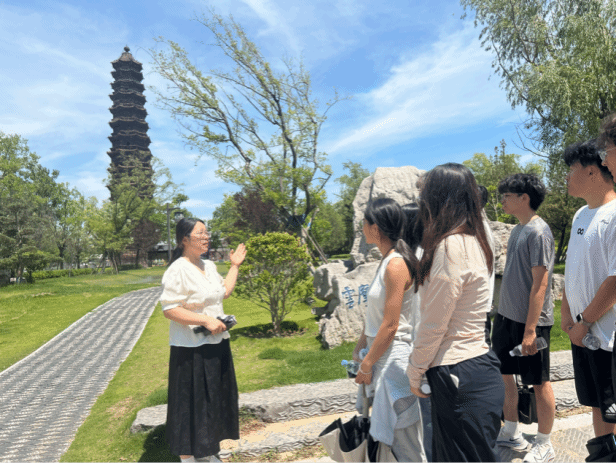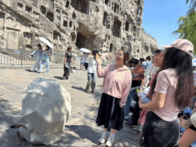在焦作红石峡,围绕“地貌认知—问题发现—专业应用”主线,引导学生掌握用专业视角解读自然、以设计手段回应场地的实践方法。然后赴茱萸峰挖掘地质地貌、生态环境与历史文化价值,思考自然人文和谐共生的空间营造;随后深入小寨沟、猕猴谷,探究“机理与城乡空间的共生逻辑”,理解自然环境下的规划设计思路。在洛阳龙门石窟之行中,师生剖析“崖壁建筑”结构智慧,开展“石窟语境下的空间营造与文化转译”研讨;在洛阳博物馆,解读新馆设计对传统元素的应用,总结“传统形制抽象化”设计手法。最后,万岁山考察聚焦“山地建筑”类型与地形,讲解地形利用与空间衔接策略;探访铁塔,对比砖石结构与现代体系,剖析“层叠出檐+中心柱”抗震原理,深化对构造与景观稳定性关联的理解,持续拓宽专业视野。