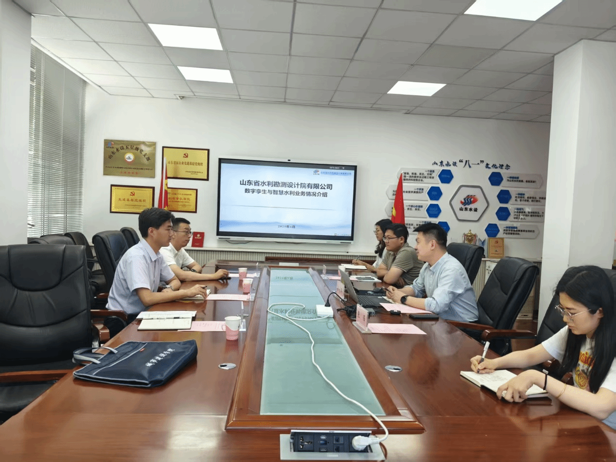随后,高涛一行转赴山东省水利勘测设计院。在此行中,团队着重考察了设计院在智慧水利技术落地应用层面的实践案例与工程经验,特别是在智慧水文监测、数字孪生流域、智能水网规划等领域的项目实施流程与技术要点,为我院智慧水利专业的应用型人才培养方案设计提供了宝贵参考。双方同样表达了在实践教学、实习基地共建及产学研项目对接上深化协作的意愿。