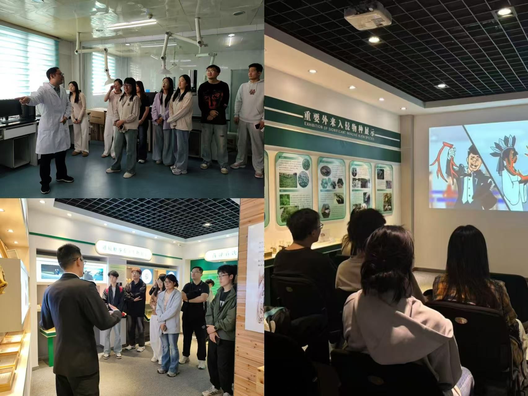 活动当日,参与活动的师生们有序抵达中国海关开启学习之旅。大家首先走进国门生物安全展厅,在讲解员的带领下,依次参观国门生物安全展厅、进境有害生物展厅以及出口特色动植物、特色食品、特色工业品展区。展厅内,文字、图片、标本等多样的展示形式,让师生们全方位了解生物安全的重大意义。紧接着,在场人员集中观看国家安全教育宣传片。通过宣传片,大家对国家安全体系有了更为深刻地理解,使命感与责任感油然而生,进一步增强了维护国家安全的自觉性。最后,在讲解员的引导下,沉浸式体验海关工作人员的日常工作,直观感受国门安全守护工作的严谨与重要。