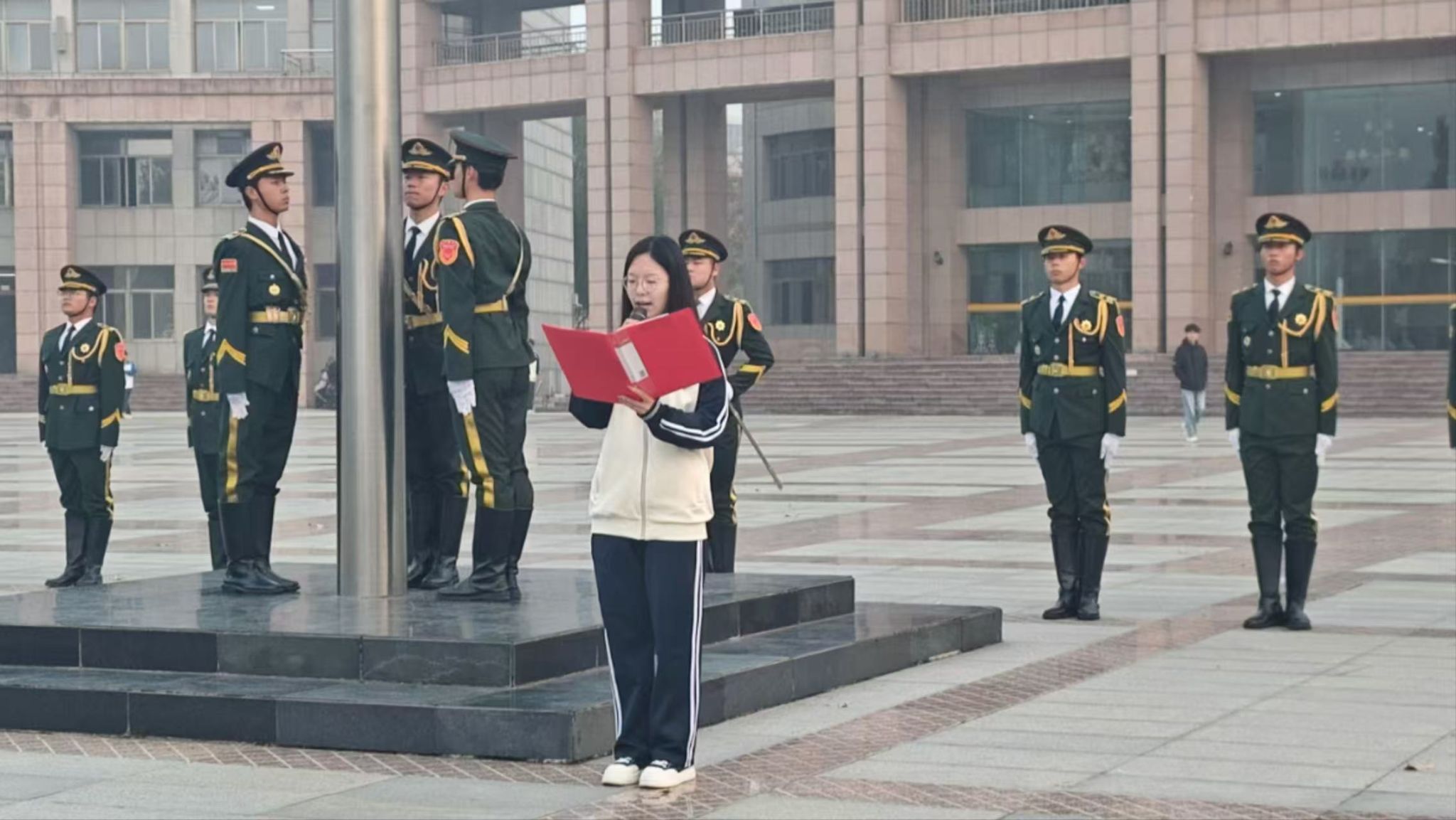 随着清晨第一缕阳光洒下,6点30分,升旗仪式正式拉开帷幕。随着一声贯彻天地的号令划破这寂静空气,国旗护卫队身着笔挺的制服,迈着整齐划一、铿锵有力的步伐,护送鲜艳的五星红旗正步走向旗杆。在这庄严的时刻,他们的每一步都透露出无比的庄重与自豪。在众人瞩目下,雄壮激昂的《义勇军进行曲》在空气中奏响,国旗护卫队们用力拉动旗绳,五星红旗伴随着激昂的旋律缓缓升起,全体同学目光紧随国旗,向国旗行注目礼,眼神中充满着对国家的无限热爱与崇高敬意,使每个人都沉浸在对祖国深深的敬仰与自豪之中。