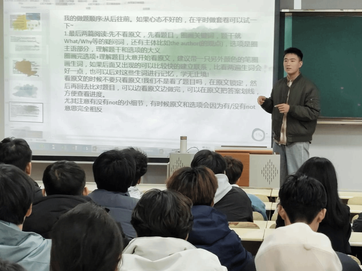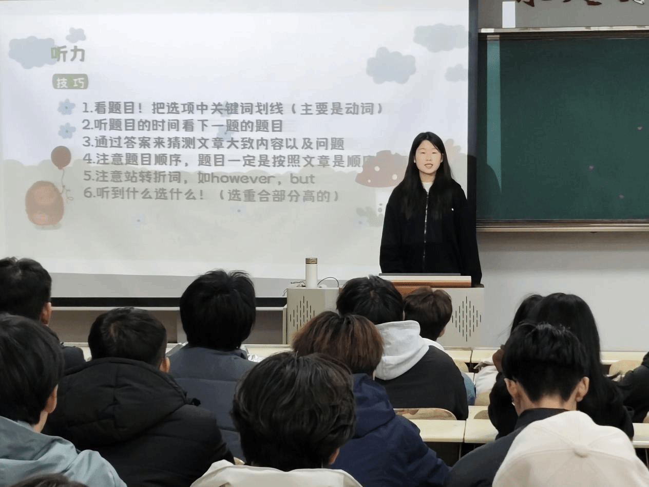 分享环节中,李晓慧学姐从考前准备、考试策略、考后反思等维度开展了深入指导,事无巨细地为同学们梳理了备考流程与注意事项。翟聪聪学长则深入浅出地解析四六级重点难点,针对不同题型传授独家应对秘籍,助力同学们精准突破。李静然学姐结合具体题目实操演练,以实例为同学们指明备考方向,让大家对考试内容有更直观的认识。