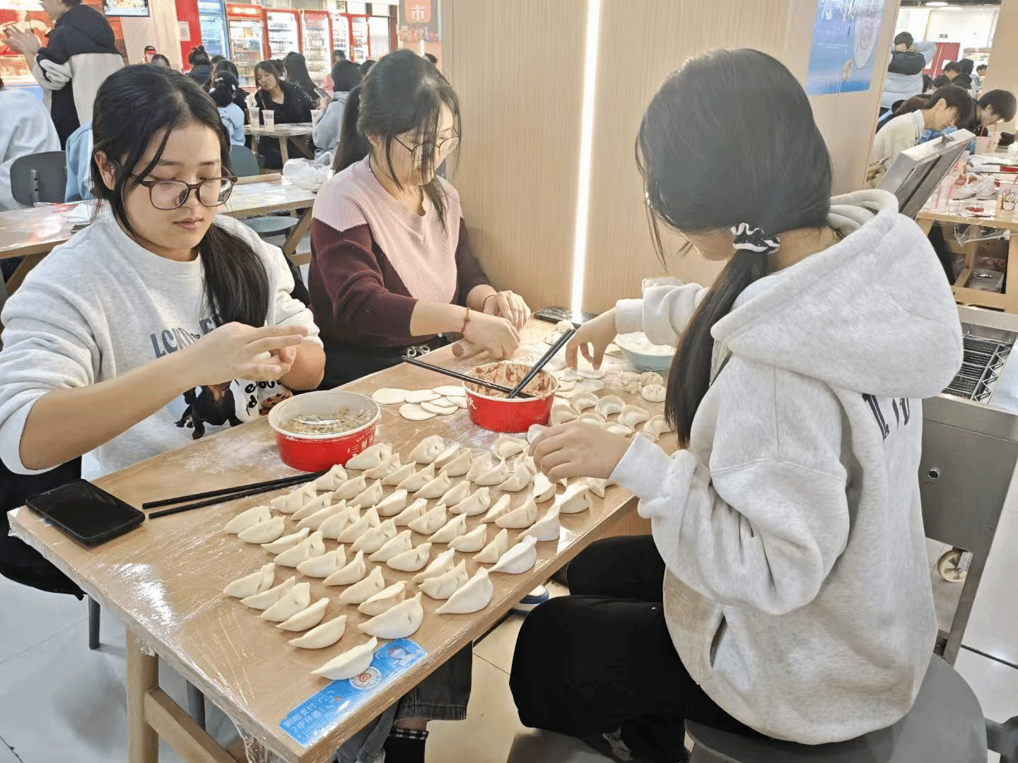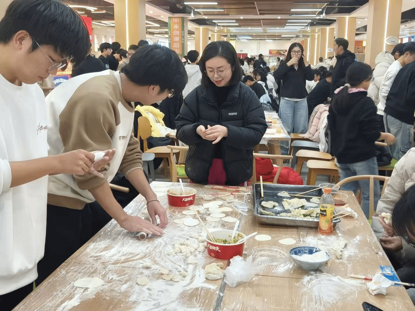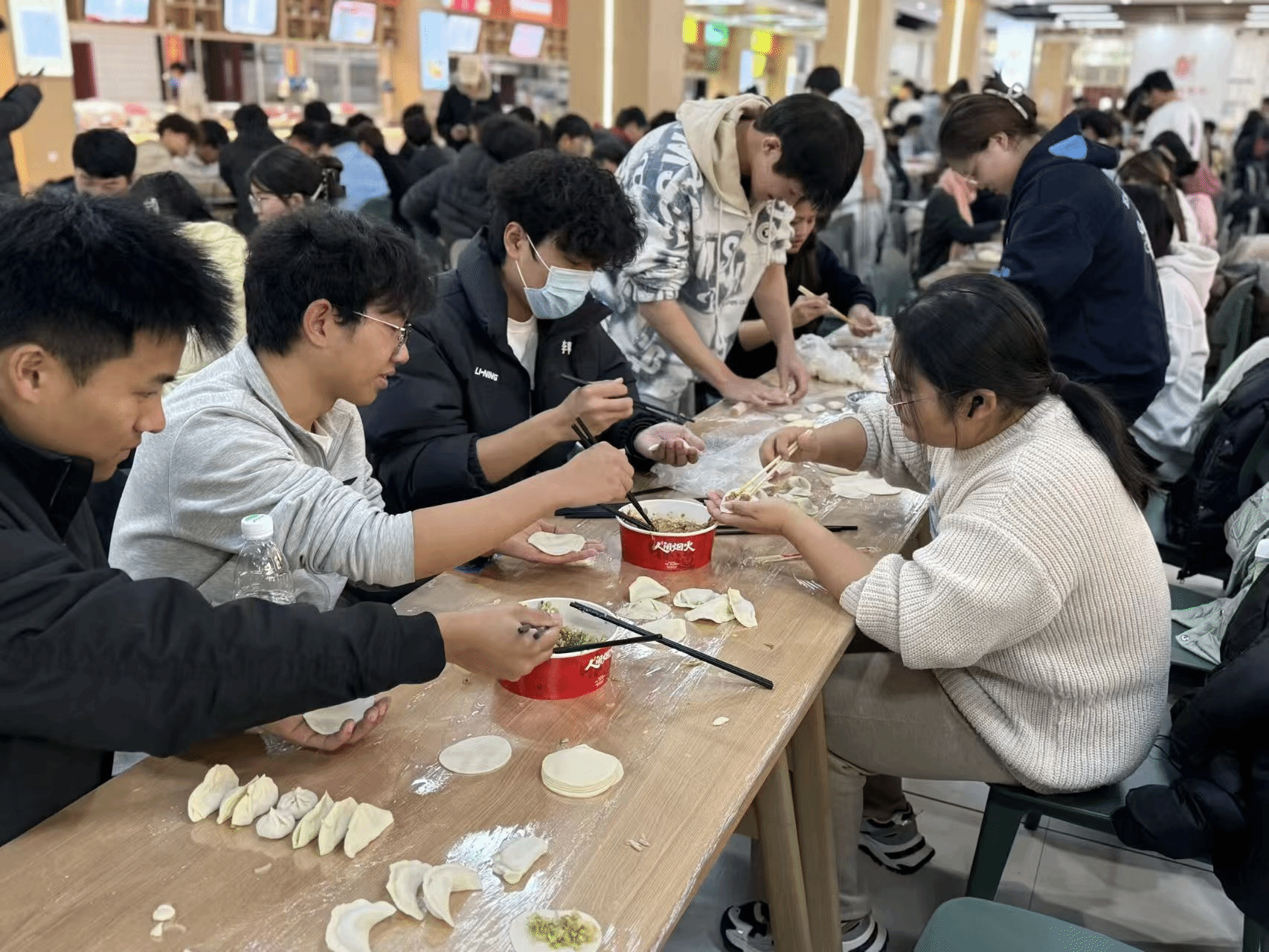 活动现场暖意融融、热闹非凡。全体师生分工明确、协作默契,擀皮、填馅、捏褶有条不紊,欢声笑语此起彼伏。初次尝试包饺子的同学,在老师和学长学姐的耐心指导下,渐渐摸索出技巧,形态各异的饺子很快便摆满了托盘。大家一边忙活,一边分享各地冬至习俗与趣闻,北方的饺子文化、南方的汤圆传统在交流中碰撞交融,让活动更添文化韵味。后厨师傅们同步忙碌,将包好的饺子下锅烹煮。热气腾腾的饺子端上桌,师生们围坐品尝,鲜香的味道与温馨的氛围交织,满溢着冬日独有的温暖。