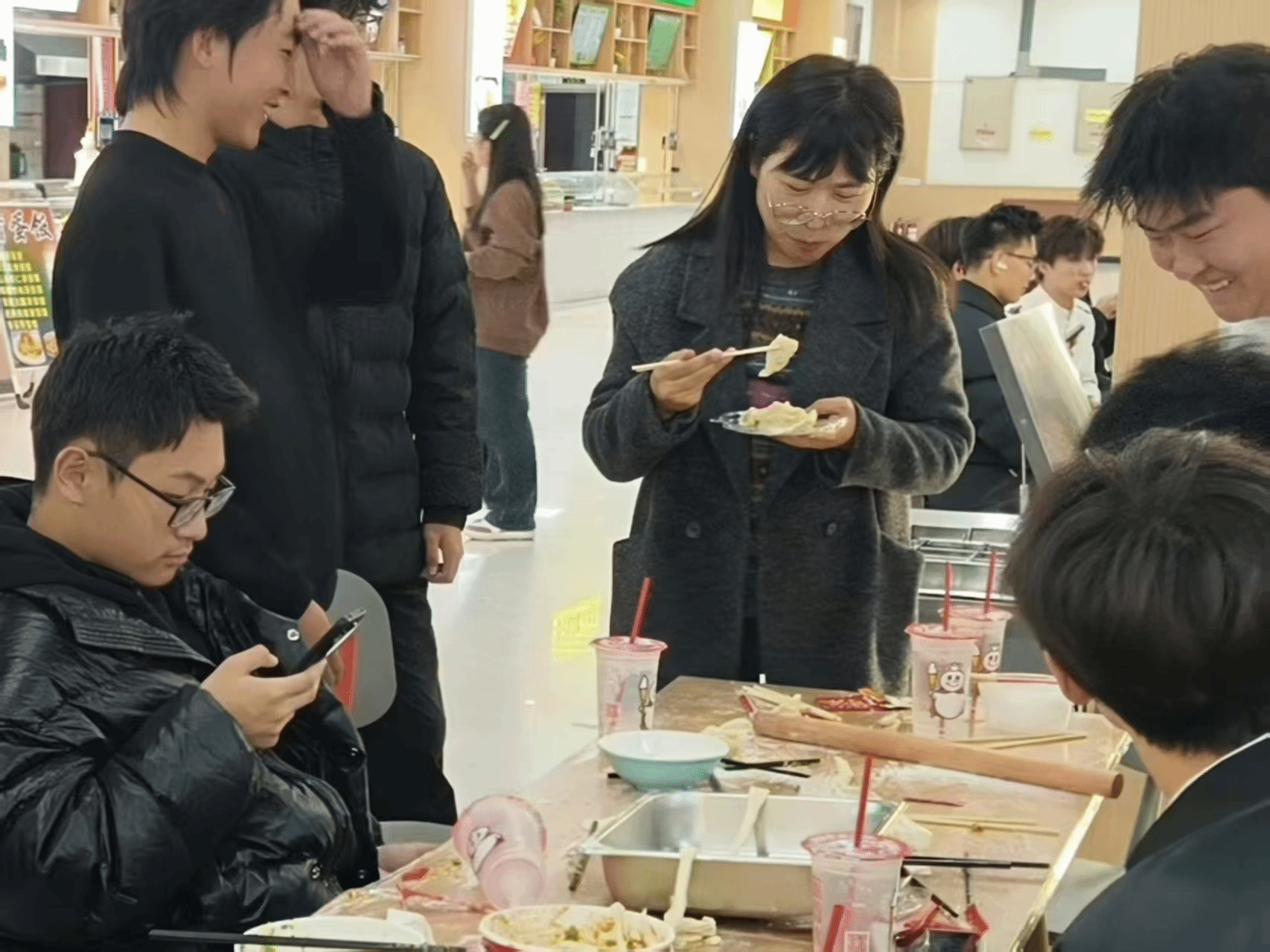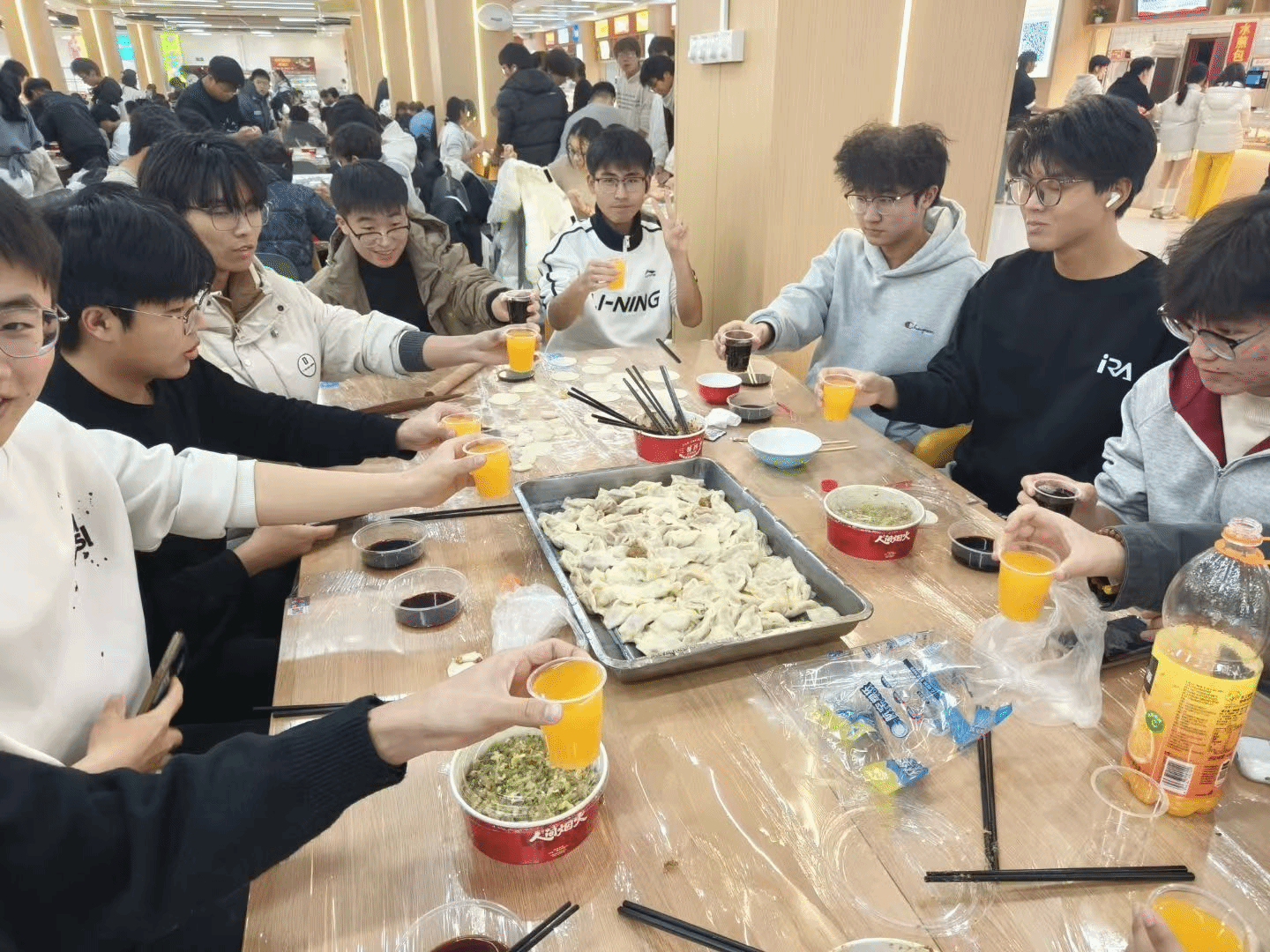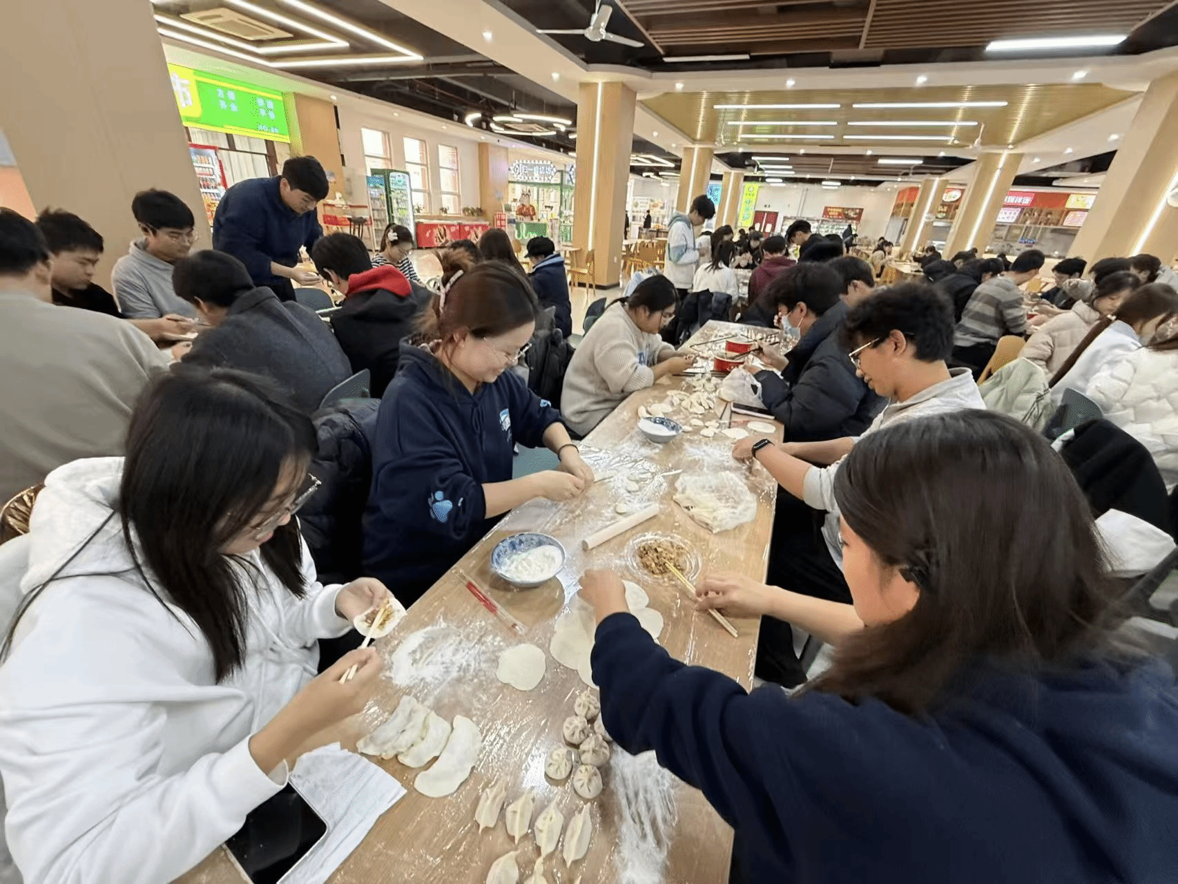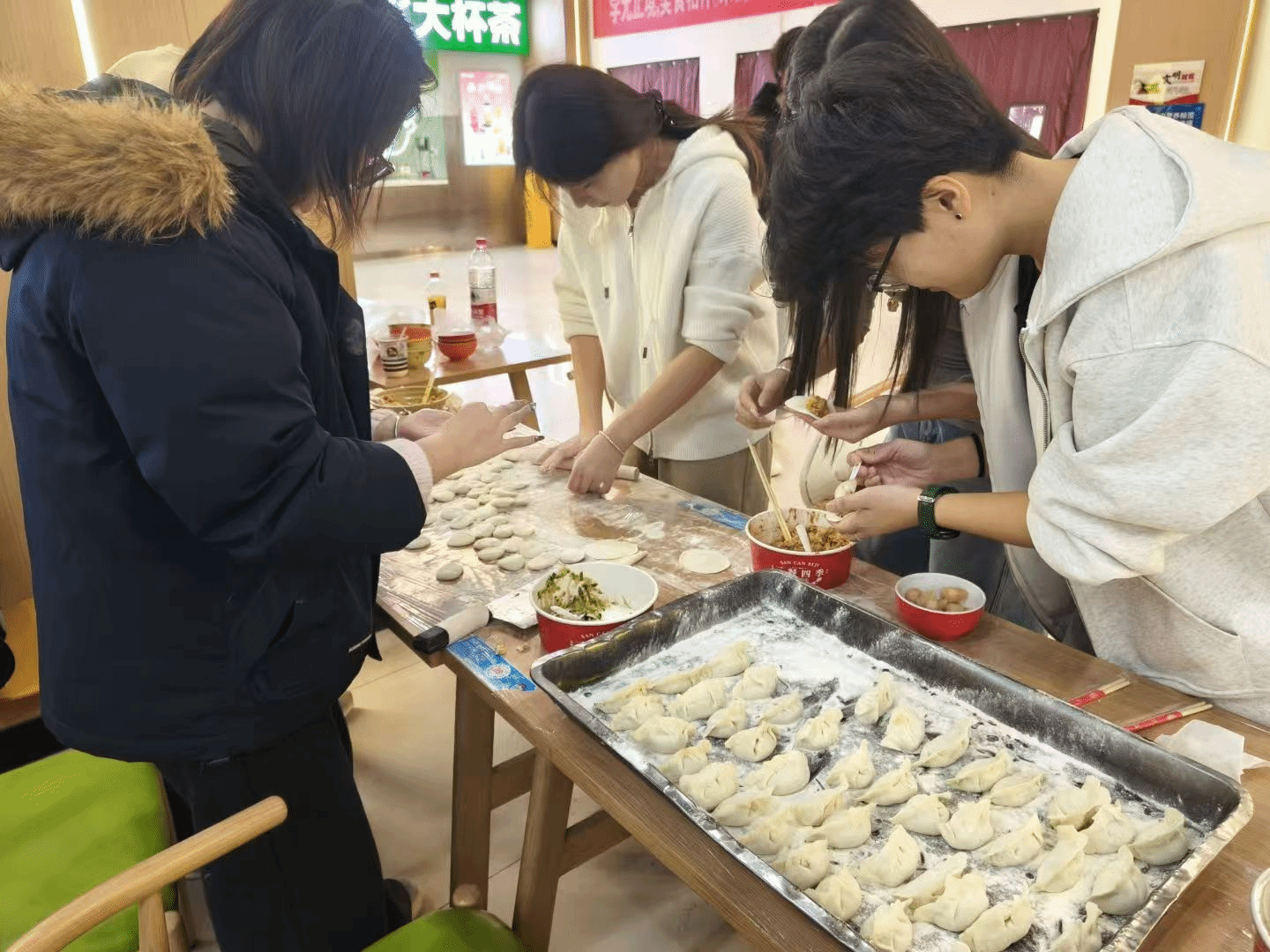 活动现场暖意融融、热闹非凡。全体师生分工明确、协作默契,擀皮、填馅、捏褶有条不紊,欢声笑语此起彼伏。初次尝试包饺子的同学,在老师和学长学姐的耐心指导下,渐渐摸索出技巧,形态各异的饺子很快便摆满了托盘。大家一边忙活,一边分享各地冬至习俗与趣闻,北方的饺子文化、南方的汤圆传统在交流中碰撞交融,让活动更添文化韵味。后厨师傅们同步忙碌,将包好的饺子下锅烹煮。热气腾腾的饺子端上桌,师生们围坐品尝,鲜香的味道与温馨的氛围交织,满溢着冬日独有的温暖。