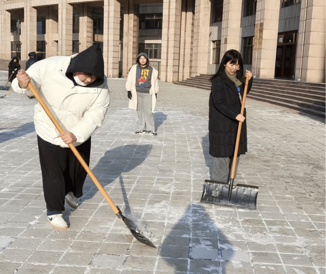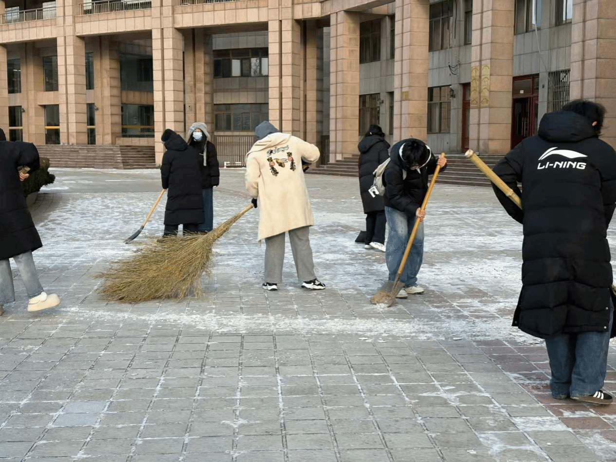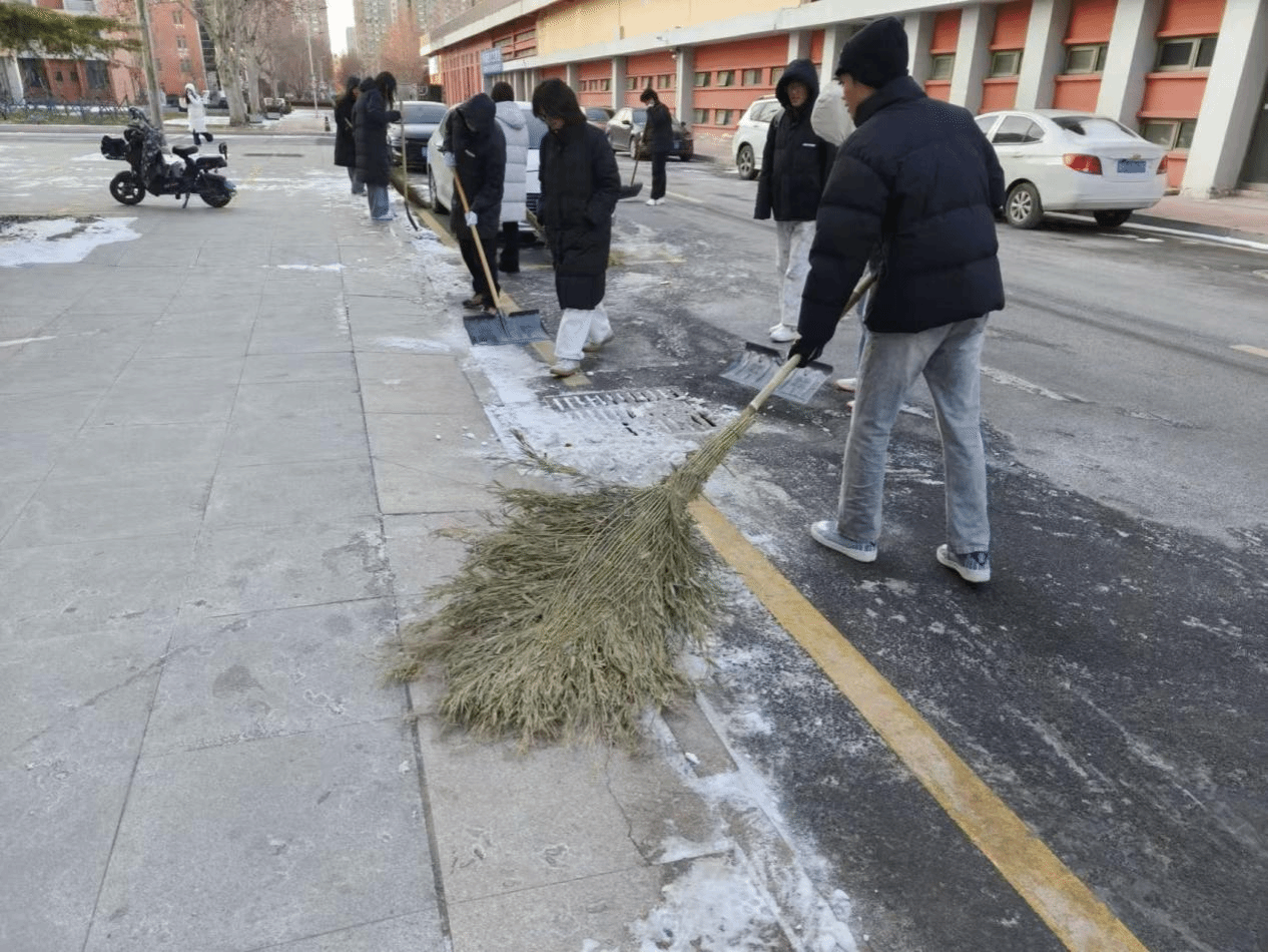活动伊始,陈伟对清扫区域进行细致划分,明确人员分工,并叮嘱大家注意防滑与工具使用安全,随后率先拿起铁锹开展清雪工作。志愿者们积极响应,手持扫帚、铁锹等工具,分工有序、配合默契,铲雪、清扫、转运等环节衔接顺畅。经过数小时的共同努力,主要路段积雪被彻底清理,路面恢复畅通。本次活动切实消除了校园出行隐患,展现出师生团结协作、勇于担当的精神风貌。