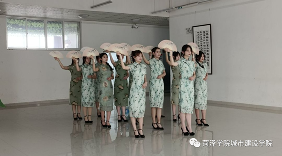 活动伊始,主持人宣布登场后,同学们身着统一的旗袍服饰,步伐统一的走向舞台中央。随后,她们以队伍中间的同学为中心,伴随着音乐节奏,对称着向前走,不断变换着位置,一颦一笑间,尽显自信与韵美。同学们都毫无保留的表现自己,迈着优美的步伐,举扇、翻转、转身、合扇,身姿曼妙,将“美”一字展现地淋漓尽致。展示结束后,李萍老师对同学们做出了评价,并从动作、仪态、面部表情等方面以身示范,她希望同学们能够全身心融入音乐韵律中,使同学们对身着旗袍时的步法有了更深刻的理解。