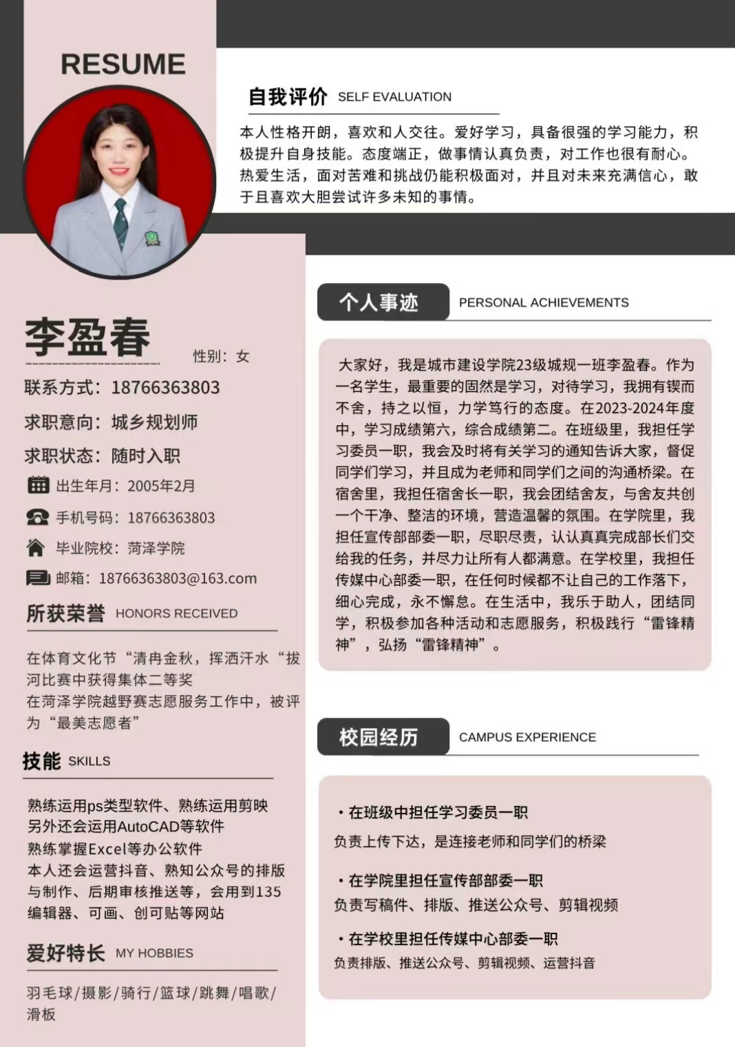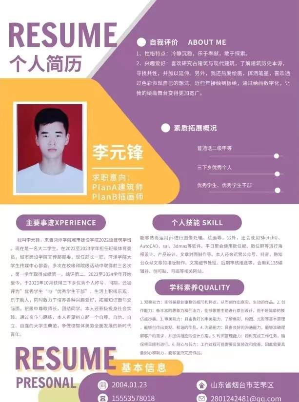 本次比赛采取线上与线下相结合的方式收集作品,各年级同学积极参与,提交的作品形式多样,创意纷呈。参赛选手从个人信息、工作经历、获奖经历及求职意向等方面围绕自身的综合素质与岗位能力做了精彩展示,选手们展现出独特的风格和出众的才能,体现出大学生积极向上、朝气蓬勃的精神风貌和职场人的职业形象。评委们对每一份作品进行细致地审阅,从简历的外观设计、内容完整性、条理清晰度、创新性等多个方面进行了严格的筛选,部分优秀简历作品脱颖而出。