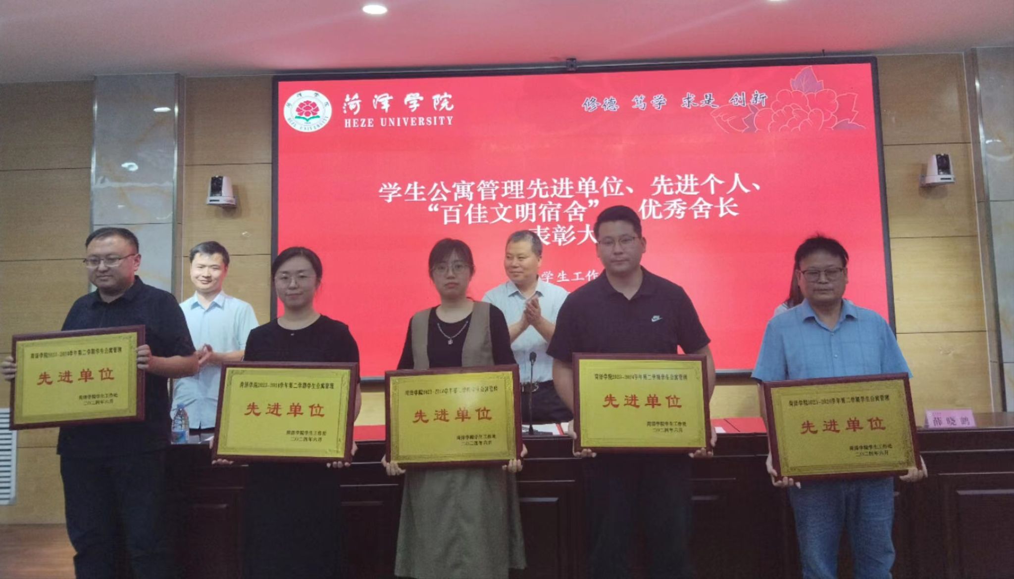 表彰会上,我院收获满满,荣获“学生公寓管理先进单位”荣誉称号;辅导员李伟、王博被评为“学生公寓管理先进个人”;城建学院所推荐12间宿舍全部获得“百佳文明宿舍”荣誉称号,12位舍长被评为“优秀舍长”。