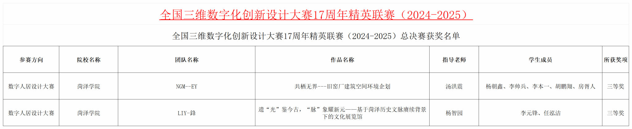 2025年7月12日,全国三维数字化创新设计大赛17周年精英联赛(2024-2025)总决赛圆满结束。大赛期间,我院师生踊跃参加,在大赛中经过层层选拔,荣获全国三维数字化创新设计大赛精英联赛总决赛三等奖两项!