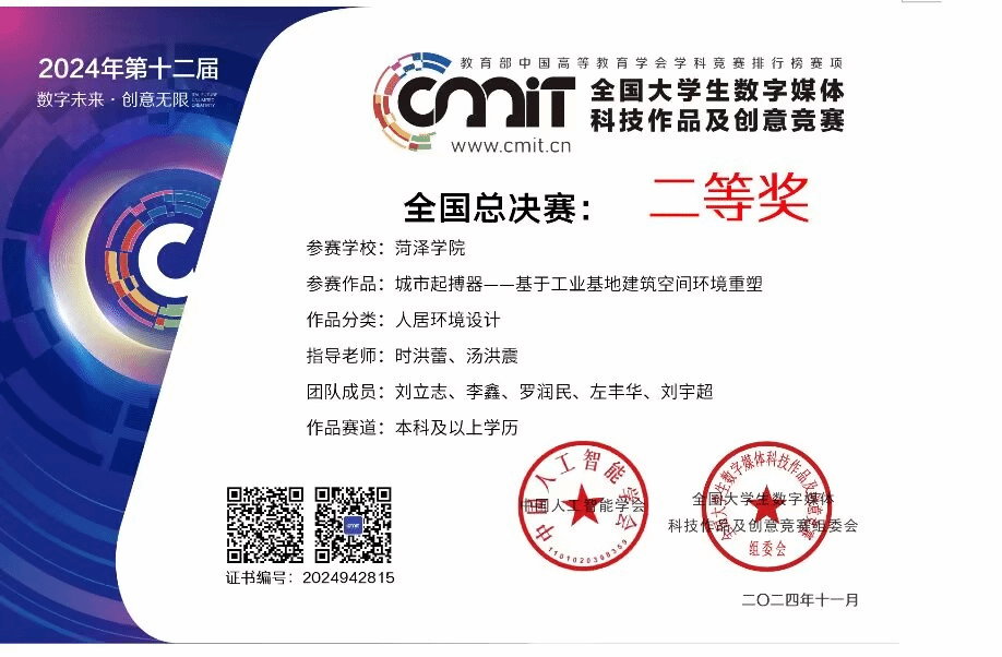 在专业竞赛领域,我凭借作品“城市起搏器——基于工业基地建筑空间环境重塑”参与全国大学生数字媒体科技作品及创意竞赛,从众多优秀项目中脱颖而出,斩获全国二等奖。此次获奖不仅是对作品创新性与技术实力的认可,也体现了我在数字媒体领域的探索与实践能力。这份荣誉激励我持续深耕专业领域,将理论知识与实践创作深度融合,未来也将不断突破自我,在数字媒体创新之路上追求更高成就,以更优质的作品展现专业素养与创新思维。