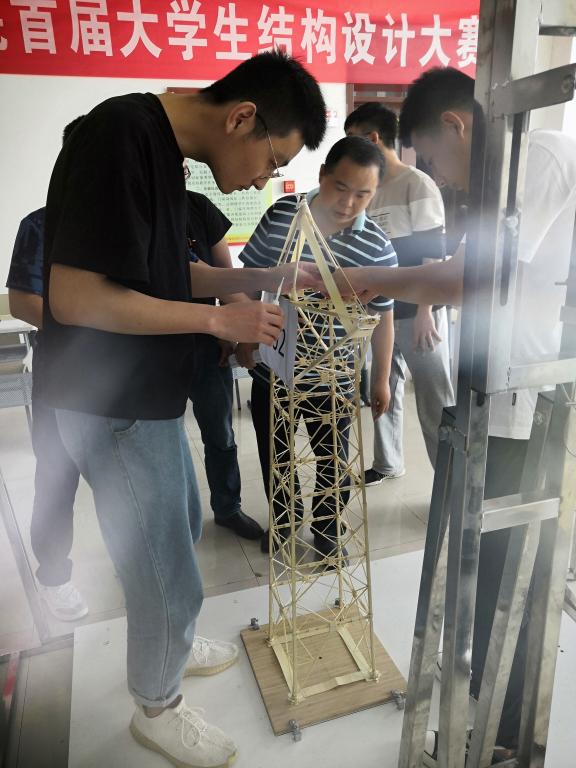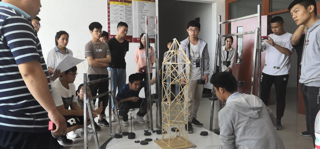 本次竞赛有4个学院13组队伍报名,最后有七组队伍成功做出作品。竞赛通过抽签方式确定小组出场顺序、加载角度和加载方案。 参赛小组制作的模型材料全部采用竹条和竹皮。参赛作品设计理念立足菏泽特色,融入菏泽当地环境。竞赛开始后首先各组派选手从设计理念、设计风格、设计质量及加载合理性等方面介绍自己小组设计制作的模型,然后评委老师分别对参赛作品进行点评。接下来,比赛分为两个环节,首先是称量模型的重量,再测试模型所能承受的荷载值。比赛的加载测试环节最为扣人心弦。每组三名参赛队员现场安装作品并对模型进行加载。参赛选手在加载砝码时,都要精心考虑砝码的重量及悬挂顺序。第一组参赛作品称重加载后,让很多参赛队员心里忐忑不安。经过紧张的综合测试后,综合选手陈述、模型表观及加载表现,得出六个参赛小组的名次。第五组获得一等奖,第一组和第四组获得二等奖,第二组、第三组和第六组获得三等奖。